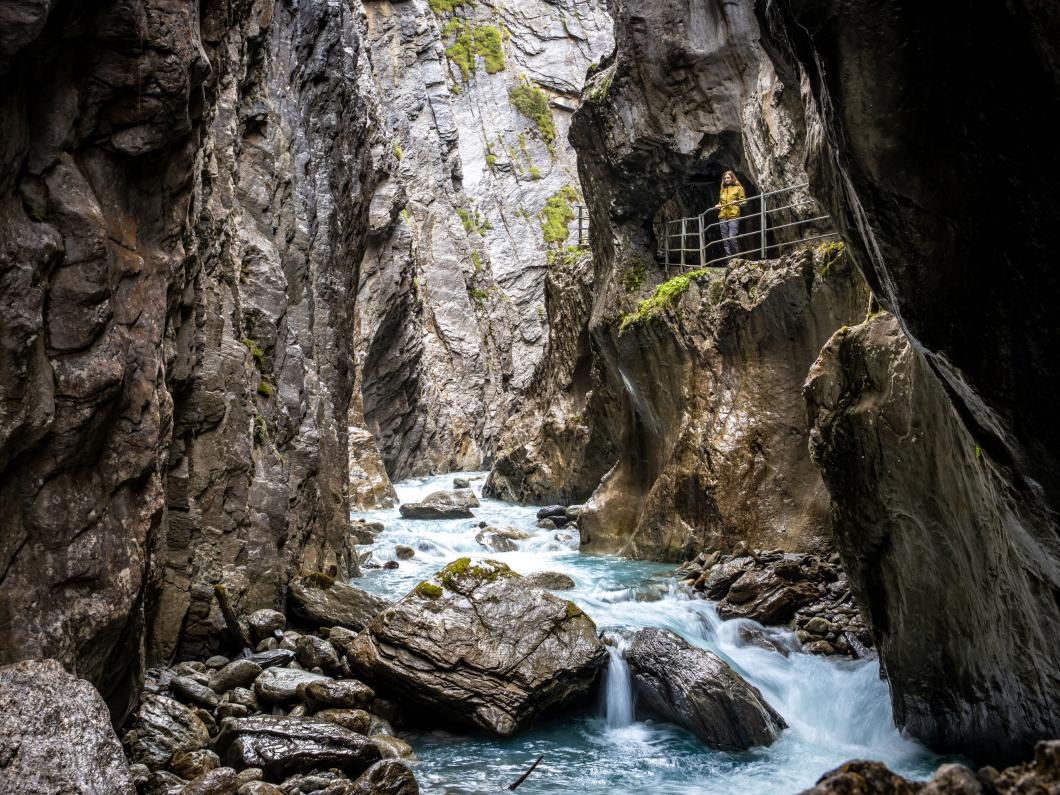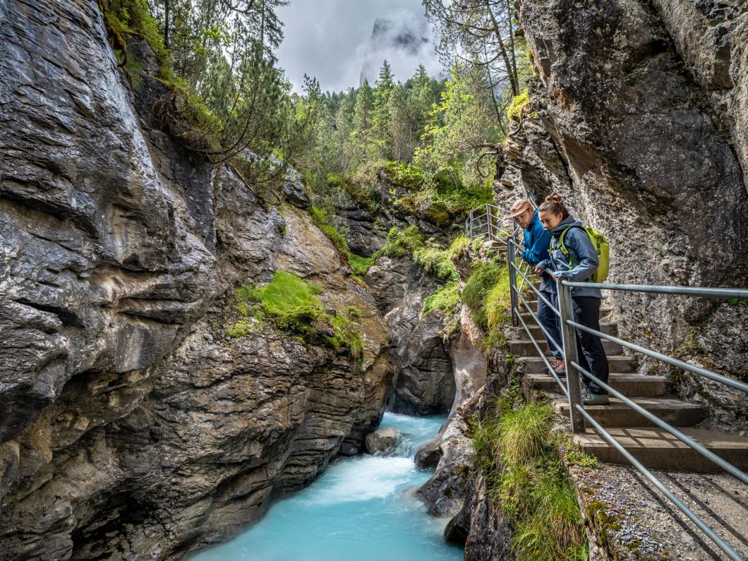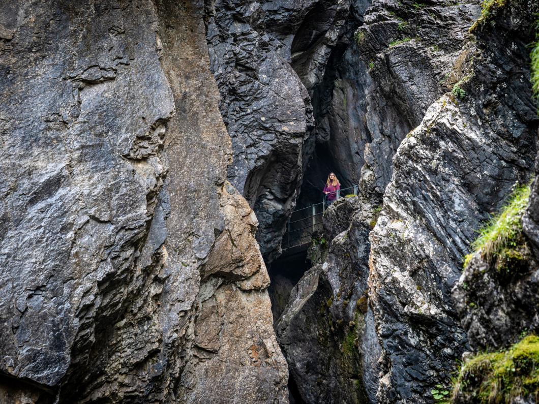 The well-built and secured path through the Rosenlaui glacier gorge allows young and old to experience a powerful natural spectacle up close. Through tunnels and over more than 200 steps you ascend 115 meters through the gorge. On the descent you walk on a gravel path with steps through a mountain forest back to the entrance. Distance about 1.2 km.