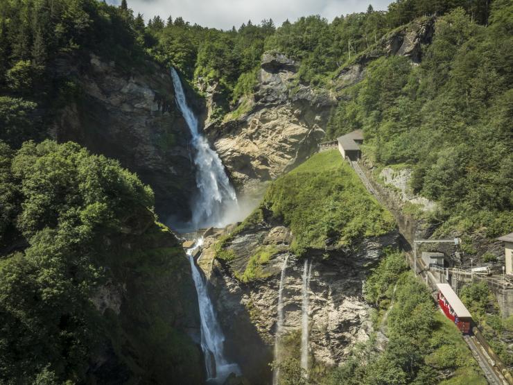 A nostalgic funicular railroad takes visitors to the impressive Reichenbach Falls.